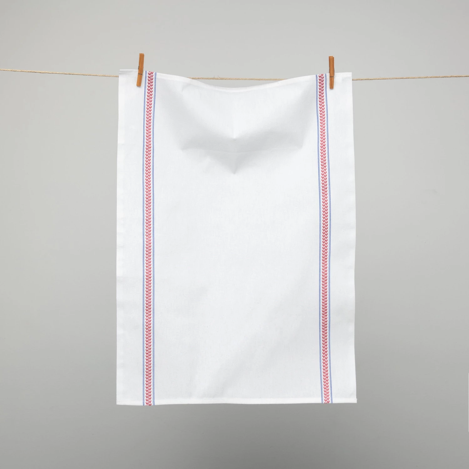 Beautiful French tea towels in crisp white cotton featuring red EpiĀ and blue stripes.