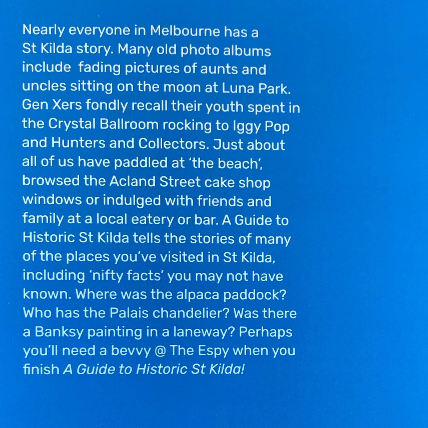 “Nearly everyone in Melbourne has a St Kilda story…..” – but do you know where the alpaca paddock was or who has the Palais chandelier? David Willis answers all the questions we never knew we had!