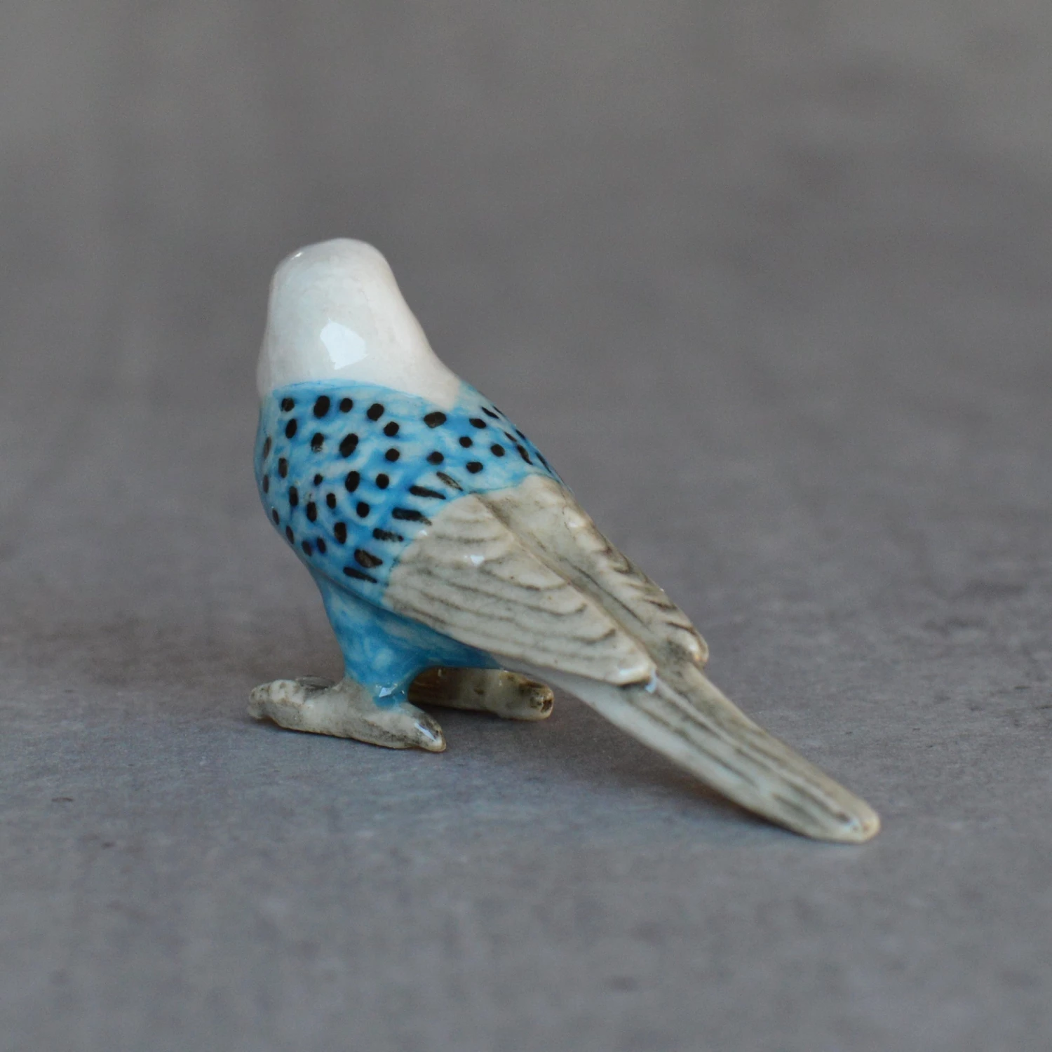 Cute little ceramic and hand painted miniature blue budgie figurine. Perfect for little gardens and shelves.