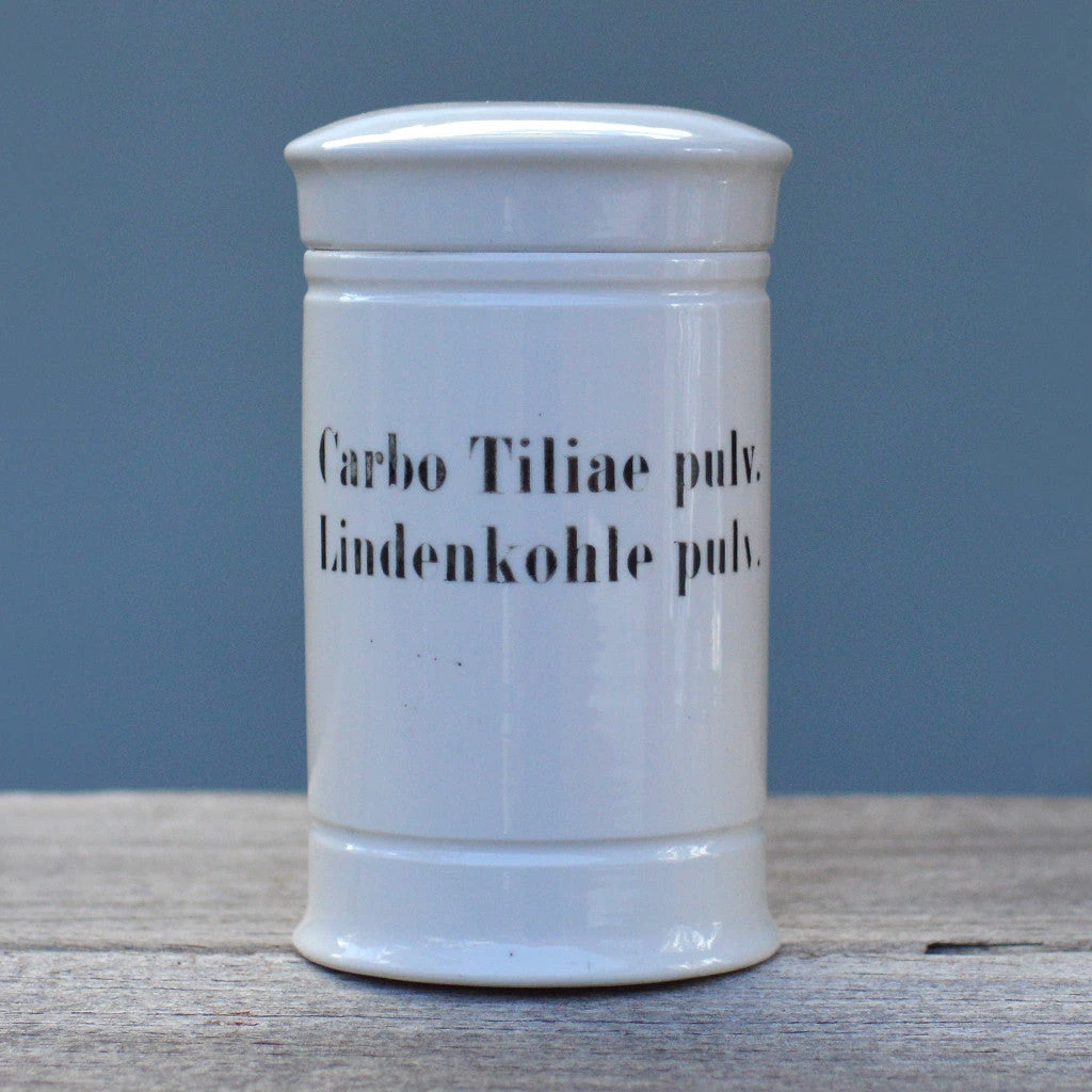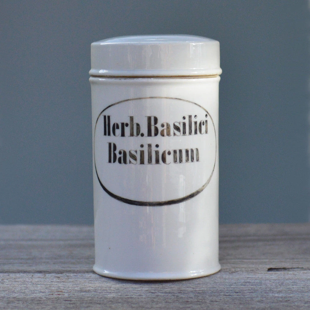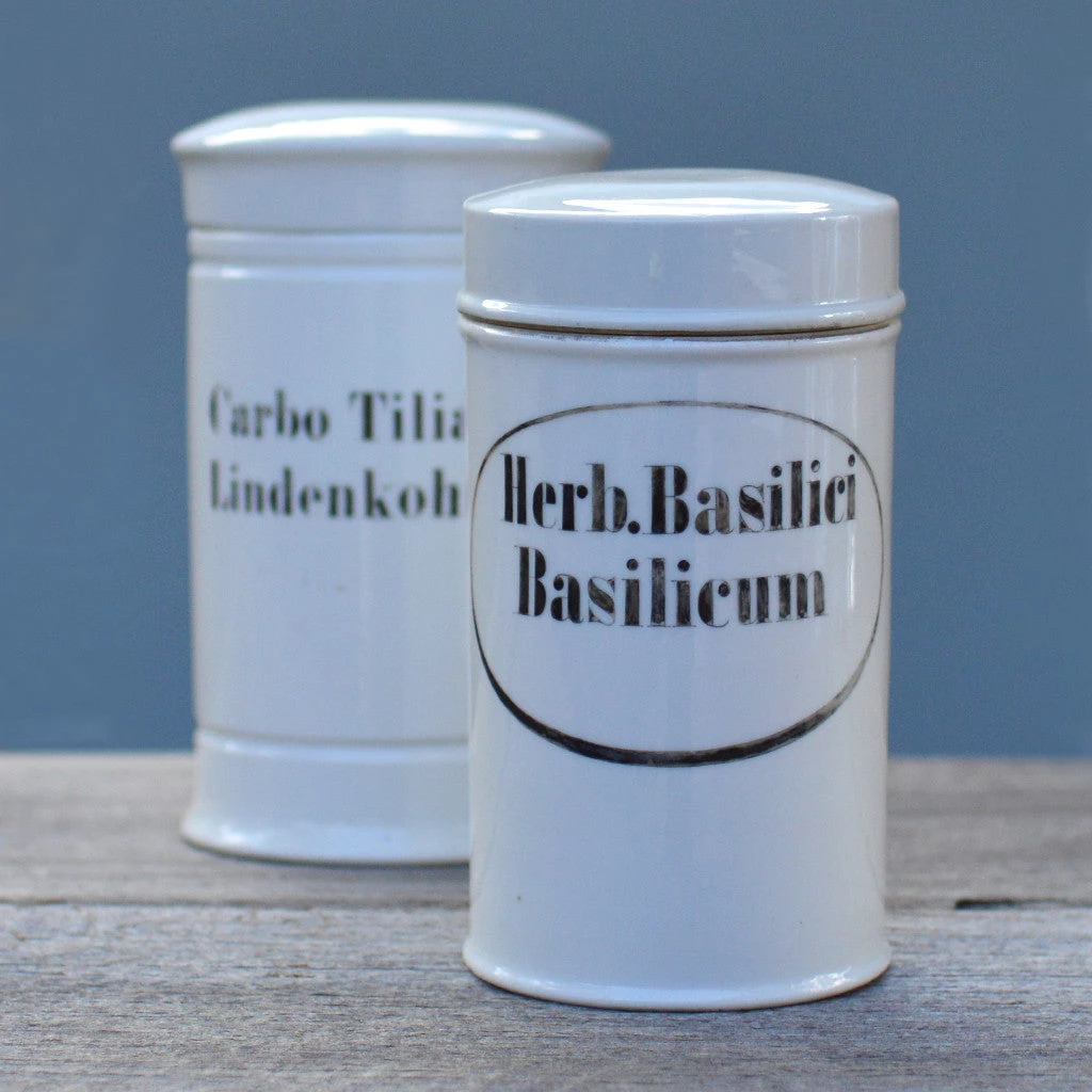 Vintage white ceramic apothecary canisters with black label. Each canister is labeled with a different compounds name.