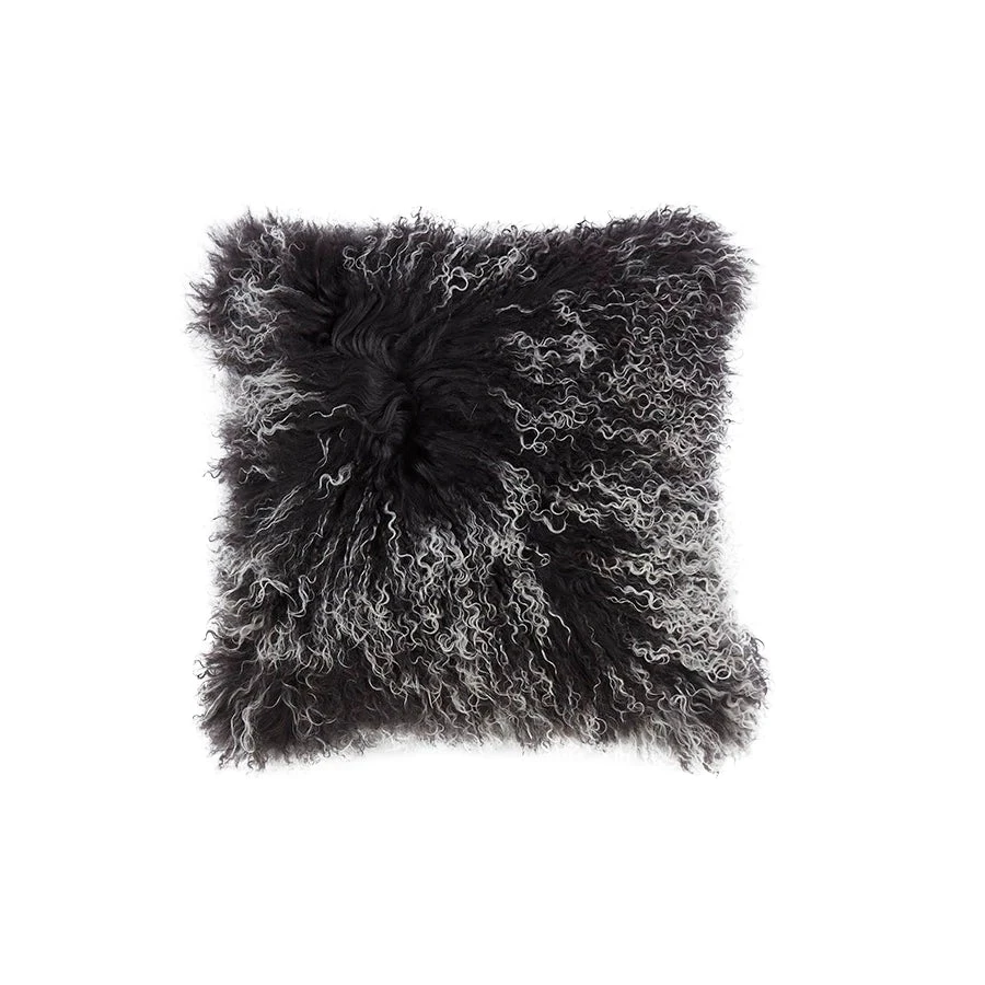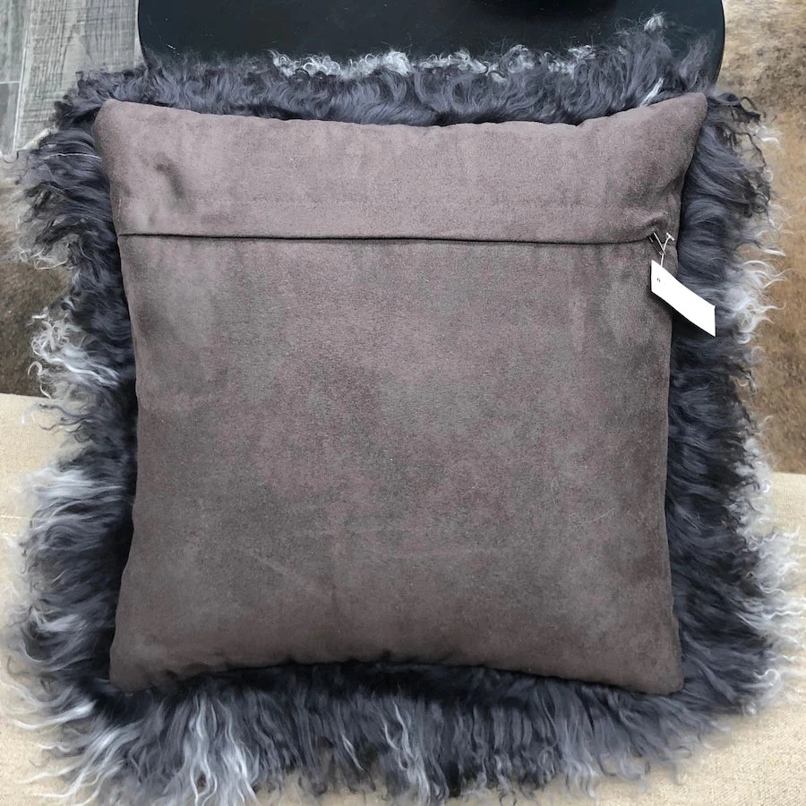 Sheepskin cushion in charcoal with a white tip.