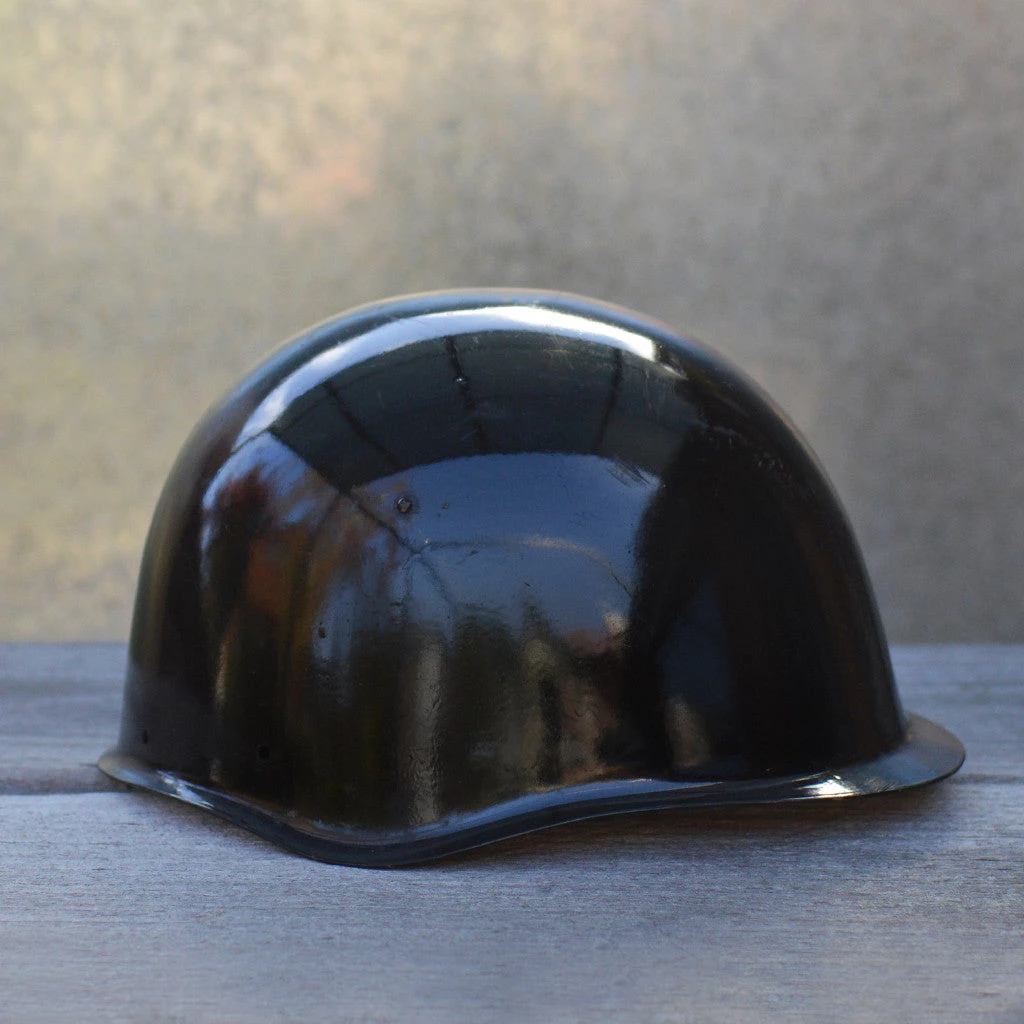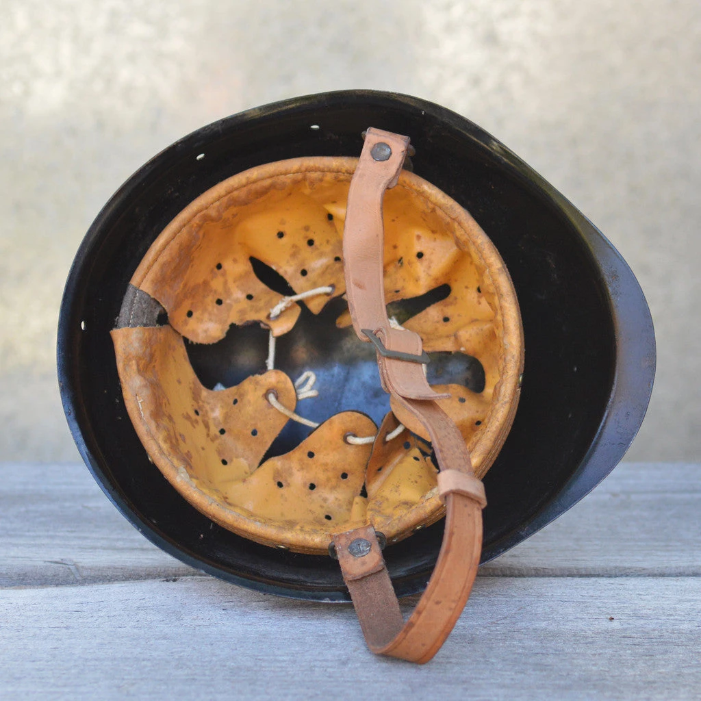 Featuring black painted steel exterior, waxed canvas and felt head hold and leather chin strap.