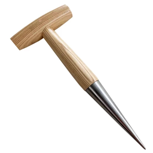 The set includes a planting trowel, hand fork and dibber all with wooden handles. Trowel and hand fork with leather straps.